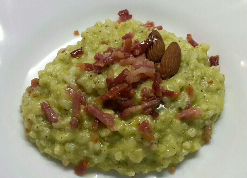 Risotto con crema di zucchine, mandorle e pancetta